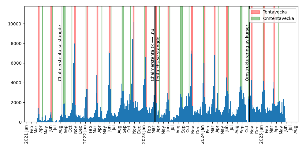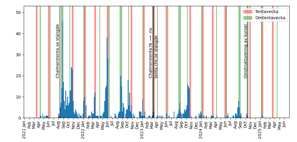 Man kan tydligt se att fler använder sidan under tenta- och omtentaperioder. Coolt! Och under sommarloven 2021 och 2023 var det nästan helt tomt här.