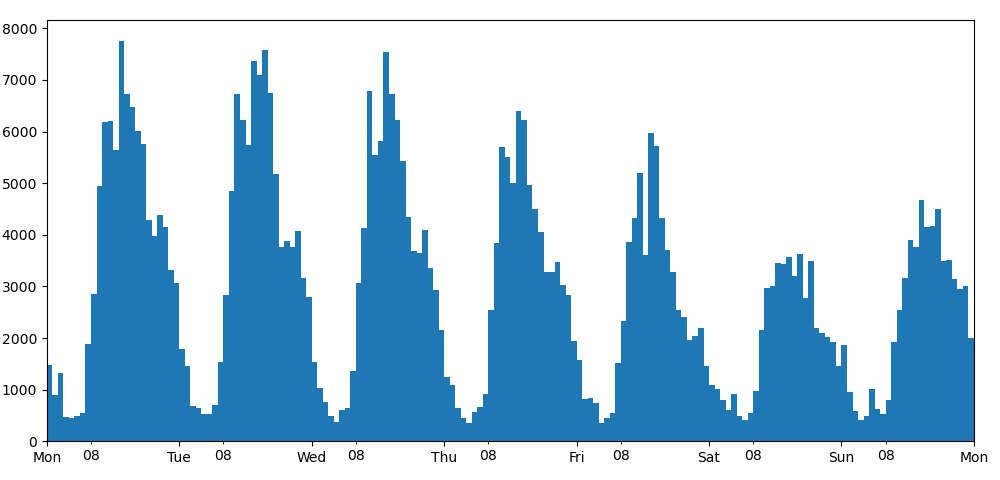 Varje stapel är en timme. Det är möjligt att den här grafen är lite biased eftersom tentaveckor alltid startar på en lördag.