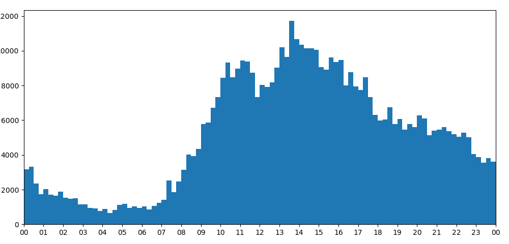 Varje stapel är en timme. Det är möjligt att den här grafen är lite biased eftersom tentaveckor alltid startar på en lördag.