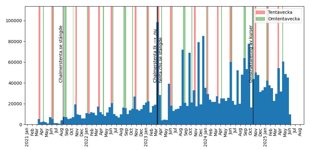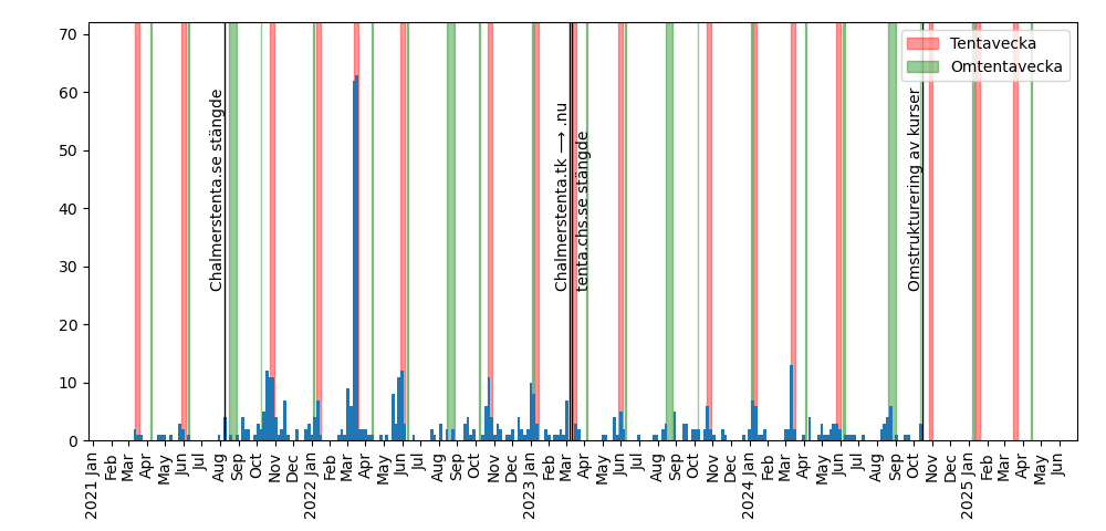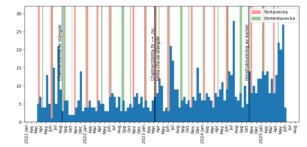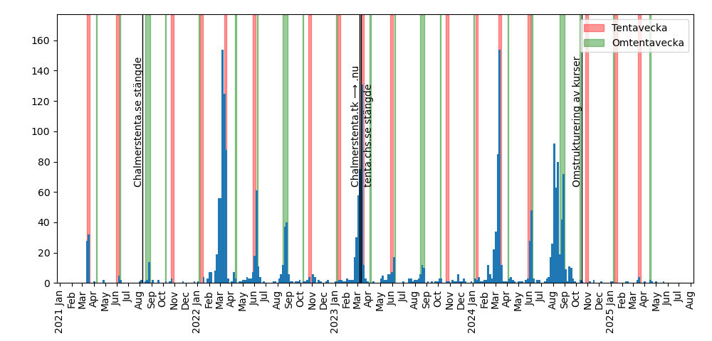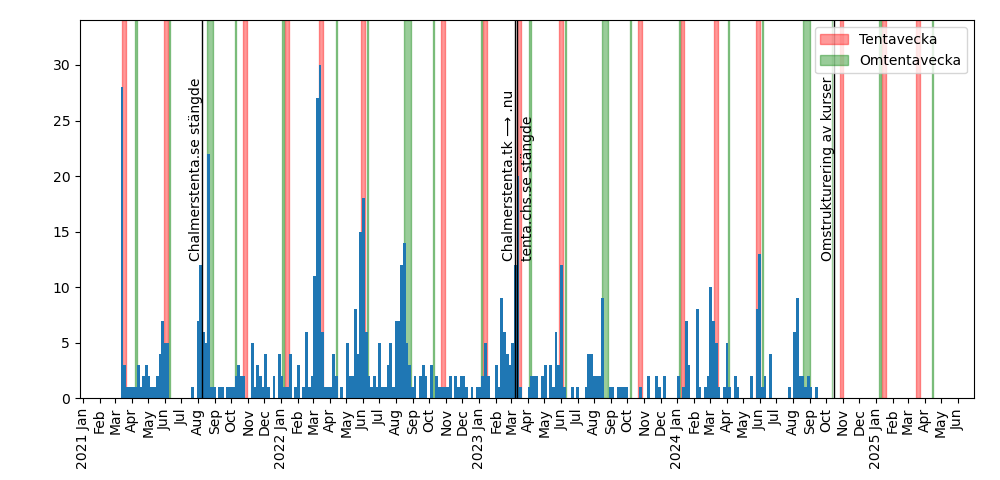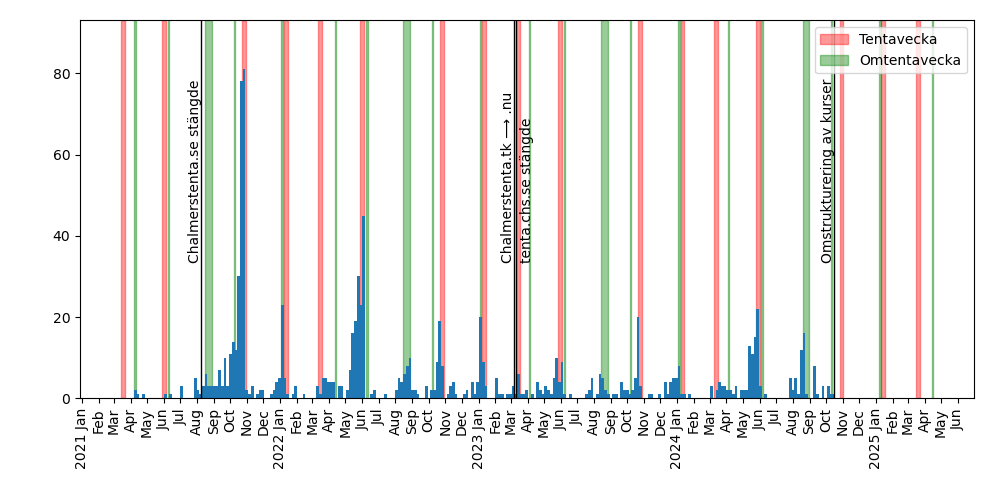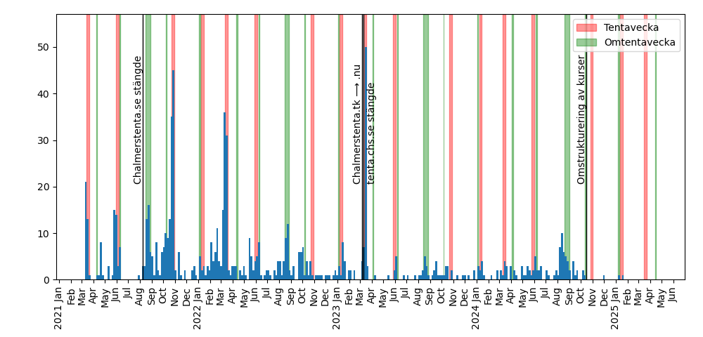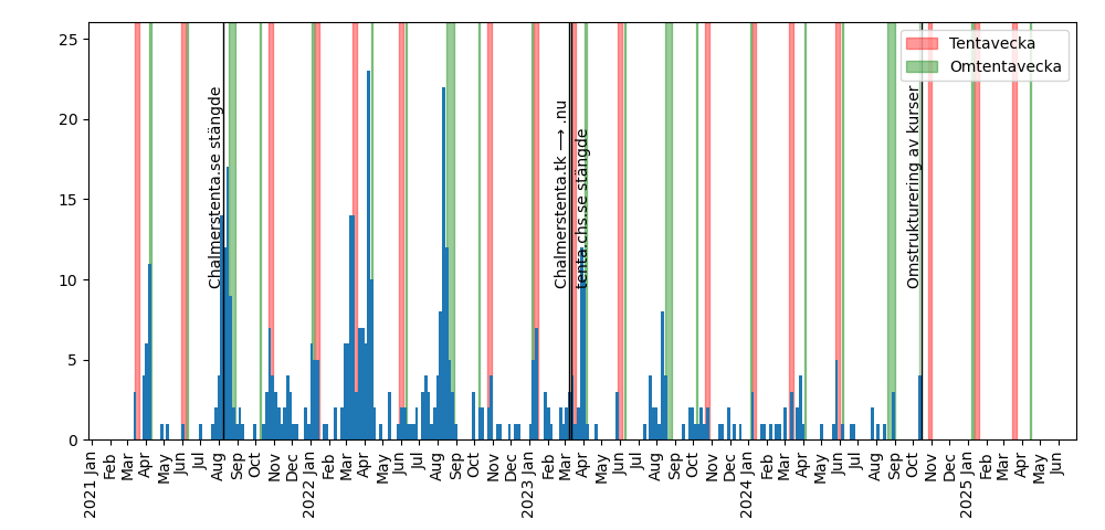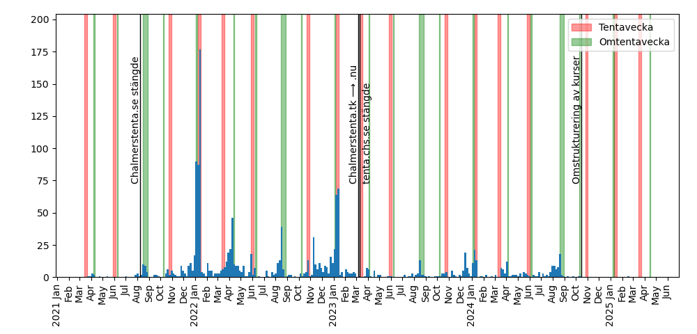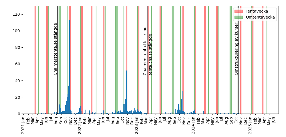 Man kan tydligt se att fler använder sidan under tenta- och omtentaperioder. Coolt! Och under sommarloven 2021 och 2023 var det nästan helt tomt här.